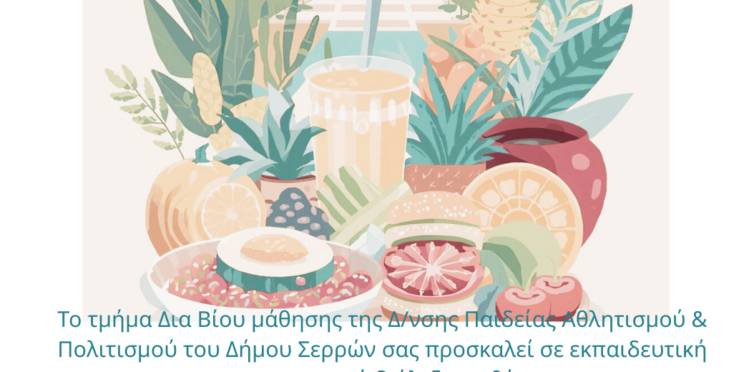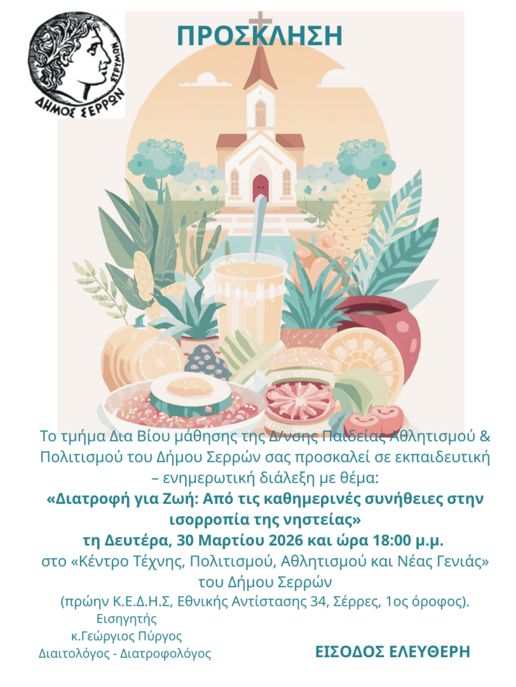Το Τμήμα Δια Βίου Μάθησης της Διεύθυνσης Παιδείας, Αθλητισμού και Πολιτισμού του Δήμου Σερρών διοργανώνει εκπαιδευτική–ενημερωτική διάλεξη με θέμα: «Διατροφή για ζωή: Από τις καθημερινές συνήθειες στην ισορροπία της νηστείας».