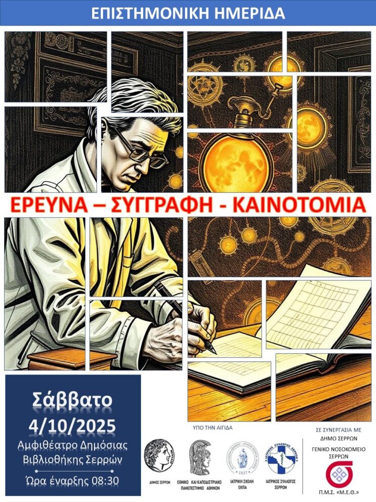 Ο Δήμος Σερρών διοργανώνει επιστημονική ημερίδα με τίτλο «Έρευνα – Συγγραφή – Καινοτομία», σε συνεργασία με το Πρόγραμμα Μεταπτυχιακών Σπουδών της Ιατρικής Σχολής του Εθνικού και Καποδιστριακού Πανεπιστημίου Αθηνών «Μονάδες Εντατικής Θεραπείας» και το Γενικό Νοσοκομείο Σερρών. Η ενημερωτική εκδήλωση τελεί υπό την αιγίδα του Ιατρικού Συλλόγου Σερρών.
