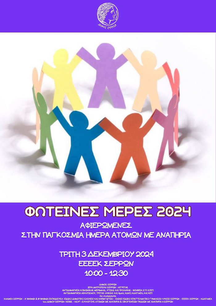 Στις 3 Δεκεμβρίου κάθε χρόνο γιορτάζεται η Παγκόσμια Ημέρα Αναπήρων. Ο Δήμος Σερρών, η Αντιδημαρχία Κοινωνικής Μέριμνας και Υγείας – Βοήθεια στο Σπίτι», η Αντιδημαρχία Αθλητισμού, Τρίτης ηλικίας και ΑμεΑ, ΚΔΑΠ, ΚΔΑΠ ΜΕΑ, και ΚΕΠ σε συνεργασία με φορείς του τόπου μας, διοργανώνουν για 11η χρονιά από το 2011 την εκδήλωση «ΦΩΤΕΙΝΕΣ ΜΕΡΕΣ».