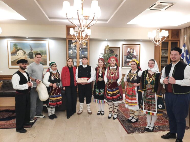 Στη συνέχεια, τα μέλη του Συλλόγου Εβριτών Νομού Σερρών έψαλλαν τα παραδοσιακά κάλαντα της Θράκης στη Δήμαρχο Σερρών, συνοδεία γκάιντας, μεταφέροντας στο δημαρχιακό μέγαρο την πλούσια πολιτιστική παράδοση της Θράκης.